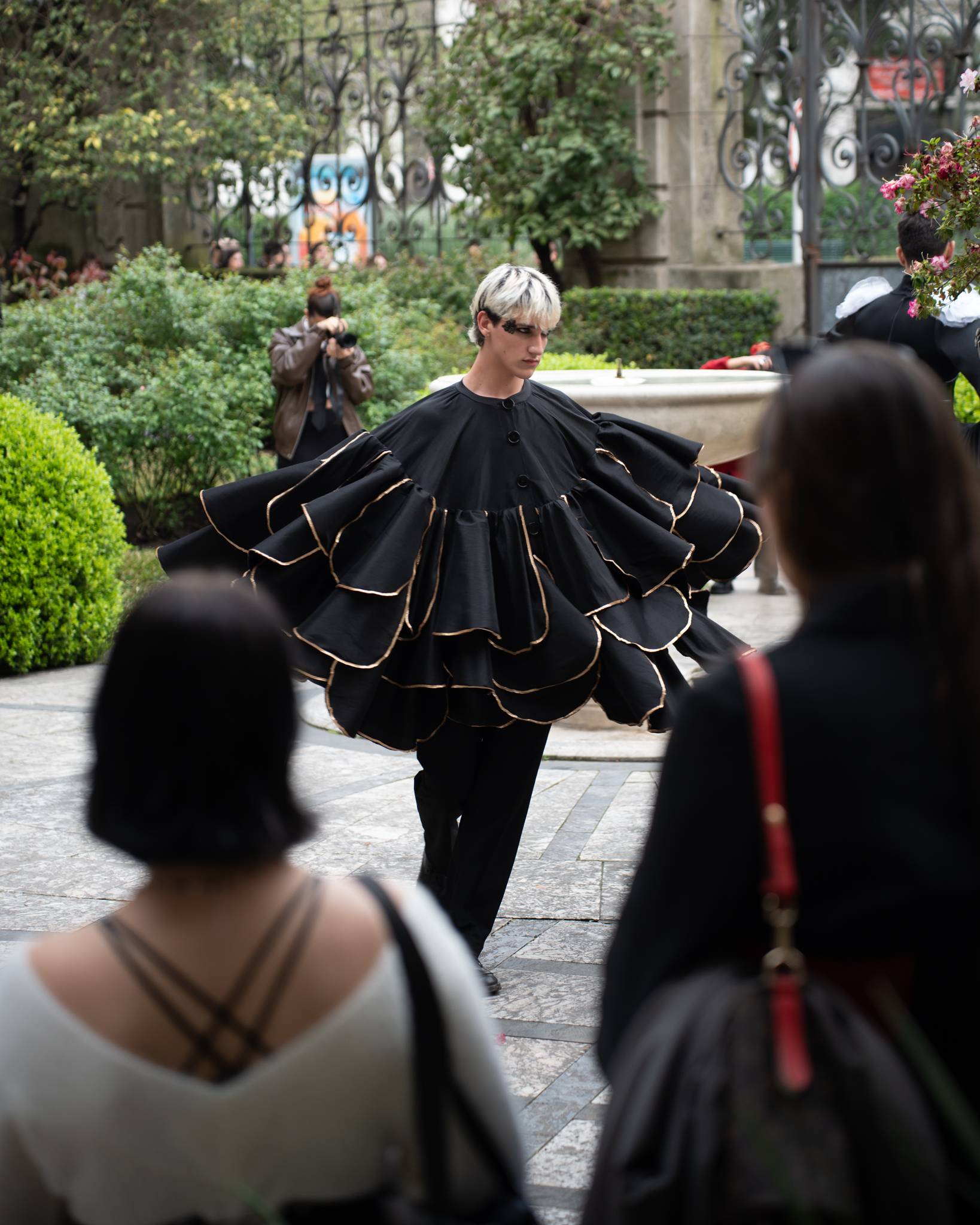 Cada pieza de la colección corresponde a una figura dentro del cuadro de El Bosco. Bordados botánicos, organza de seda cruda e impresiones pintadas a mano crearon un puente entre el siglo XV y el cuerpo contemporáneo.